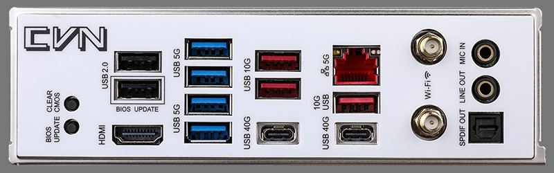 后置接口:2× USB-C 40Gbps(支持 DP Alt)、3× USB-A 10Gbps、4× USB-A 5Gbps、2× USB-A 480Mbps、1× HDMI 2.0、1× 5GbE RJ45、2× Wi-Fi 天线接口、1× S/PDIF-out、2× 音频插孔。