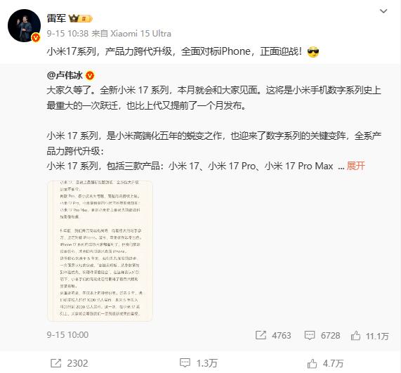 9月15日,小米公司创始人雷军发文称,小米17系列,产品力跨代升级,全面对标iPhone,正面迎战。