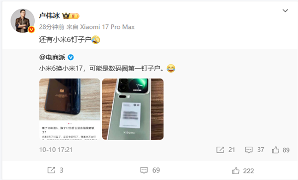 这一现象也引发小米集团总裁卢伟冰的关注,他发了个哭笑不得的表情包:“还有小米6钉子户”。