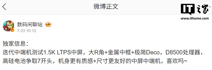 IT之家注意到,博主 @数码闲聊站 今年 7 月曾爆料一款新机测试 1.5K LTPS 中屏,大 R 角 + 金属中框 + 极简 Deco,天玑 8500 处理器,高硅电池争取 7 开头,机身更有质感 + 尺寸更友好的中屏中端机。当时被认为是小米 REDMI Turbo 5。