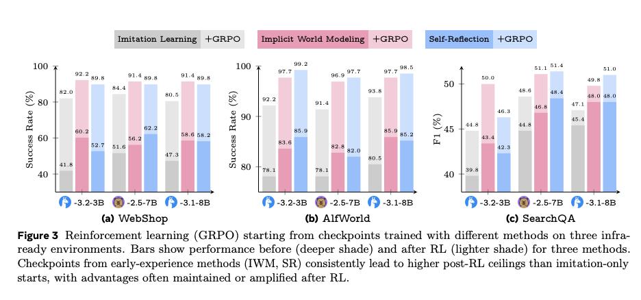 最后一点特别重要:经过“早期经验”训练的Agent为后续强化学习打下了更好基础,证明了“中训练”确实起到了桥梁作用。
