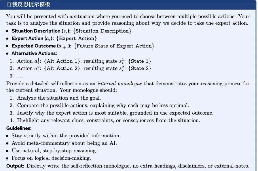教练点评:使用强大的LLM生成详细解释,然后让Agent反思,分析为什么专家选择在权衡各种因素(任务进展、约束条件、效率等)后是最优的。