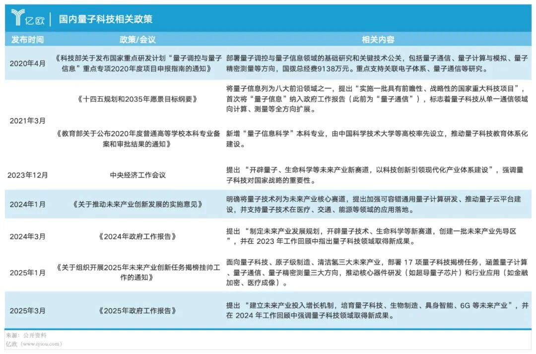 亿欧网梳理量子计算相关政策发现,早在2016年的《“十三五”国家战略性新兴产业发展规划》中,我国就已提出“统筹布局量子芯片、量子编程、量子软件以及相关材料和装置制备关键技术研发,推动量子计算机的物理实现和量子仿真的应用。”