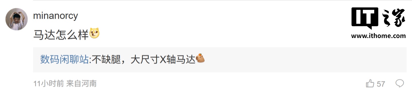 ”;另一名用户则询问道:“马达怎么样”,博主则回复道:“不缺腿,大尺寸 X 轴马达”。
