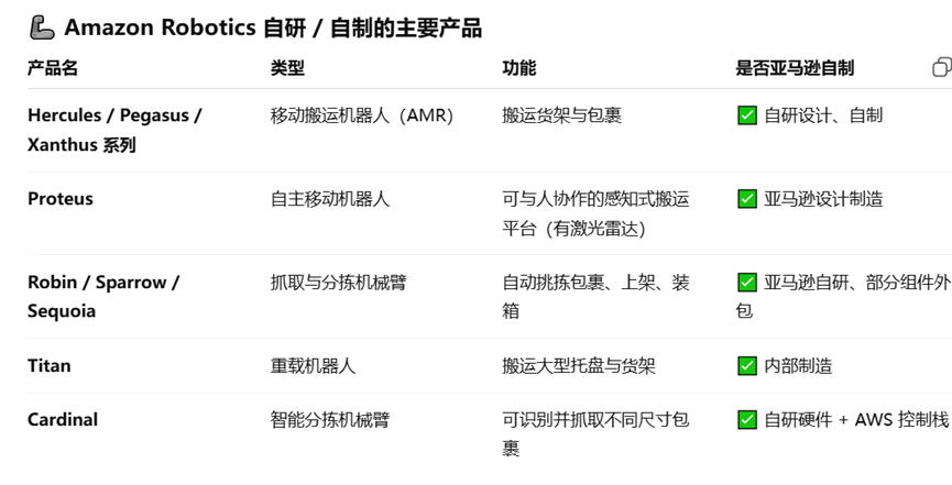 亚马逊已经建立起了一个世界上最大的机器人和自动驾驶自主研发、设计与制造体系,而且全部在亚马逊自家的工厂组装(Amazon Robotics Manufacturing Facility),包括机械结构、电机模组、控制系统、软件堆栈都是内部设计。