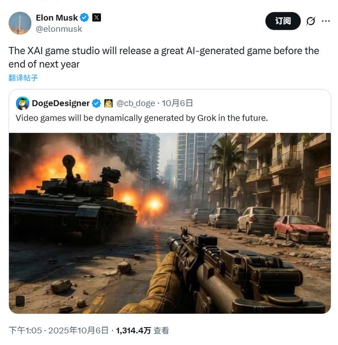 马斯克本人也在社交平台X上确认,xAI将在“明年年底前发布一款出色的AI生成游戏”。长远来看,这些技术最终可能应用于机器人的人工智能系统。