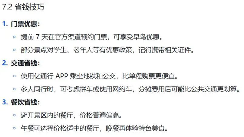 同样是交通方面,豆包也展现出了一个亮点,它清晰的列出了用户抵达北京后从酒店到景点以及景点之间的交通方式:
