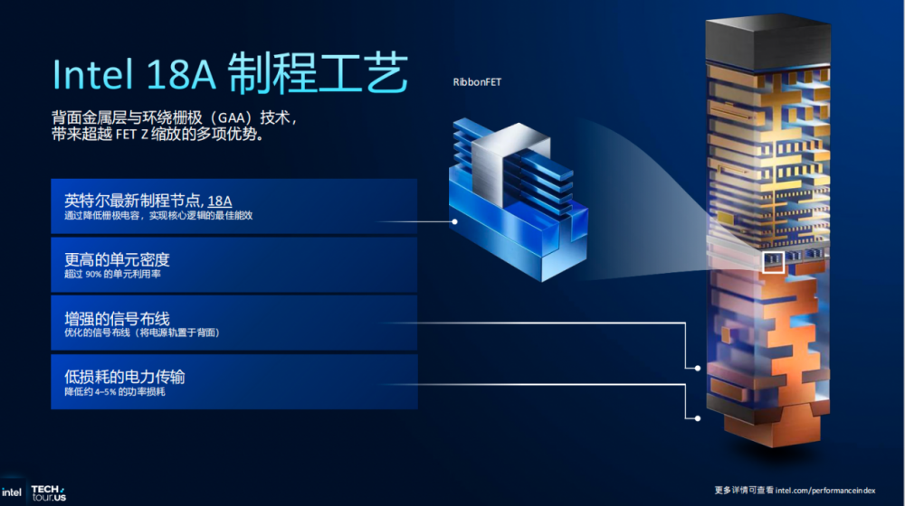 从制程工艺角度来看,Intel 18A是业界首次将背面金属层(PowerVia)以及全环绕栅级技术(RibbonFET)结合在一起,可以达到降低栅极电容,提高核心逻辑密度以及能效的效果。经过内部测算和实际设计数据,使用Intel 18A制程可以得到更高的单元密度,可以产生超过90%的单元利用率,在相同功耗下性能提高4%。