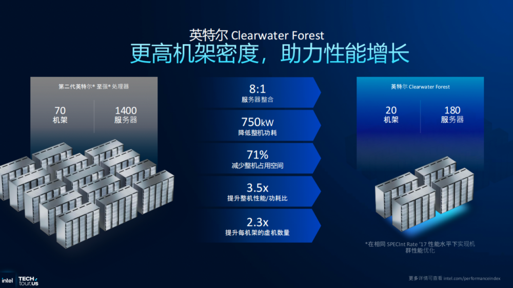 英特尔技术专家指出,如果将至强6+和第二代至强处理器进行横向对比,今天仅用20台机架180台至强6+服务器就可以替代70个机架1400台第二代英特尔至强服务器,实现相同的算力,实现8:1的服务器整合比例;同时由于服务器和机架功率降低,用户可以降低整机功耗750KW,降低71%的数据中心占用空间,同时提升3.5倍的性能/功耗比,每台机架上也可以增加2.3倍的虚拟机部署数量。“至强6+处理器系列不光是简单的性能升级,而是一个全新的跨时代的产品,它将为英特尔未来的服务器产品系列树立新的标杆。”