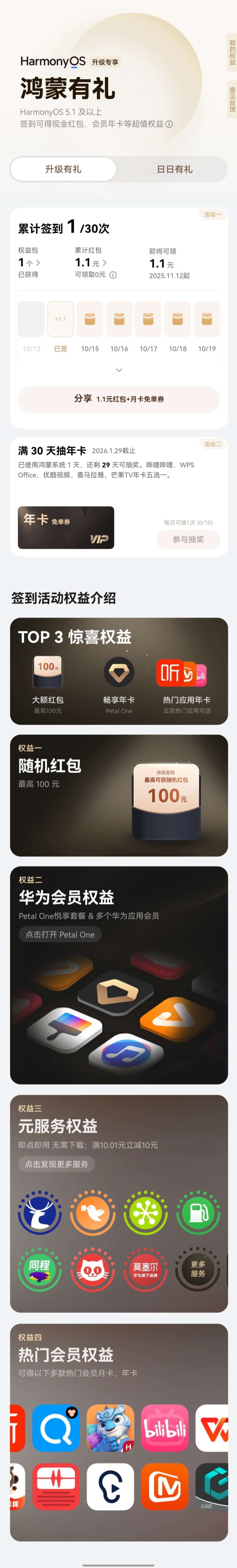 • 《老用户可薅羊毛:华为全新鸿蒙有礼活动开启,含最高 100 元随机现金红包、三方应用年卡等》