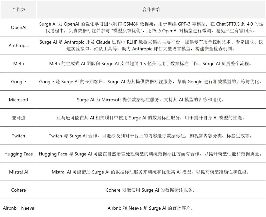 Scale AI做的生意也是给大模型企业提供数据标注和训练,被戏称为AI界的富士康,客户涵盖了OpenAI、微软、谷歌、Meta等各大AI头部公司。