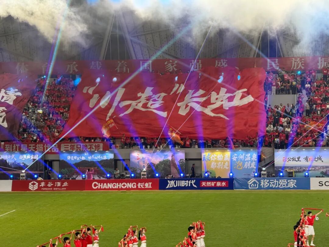 一群身着红色足球宝贝服的孩子们,作为长虹足球宝贝,与运动员手牵手一同入场,而他们的父母,皆是长虹控股集团的技术骨干、劳动模范。川超的赛场,也潜移默化成为了长虹展示硬核技术和产业实力的秀场。