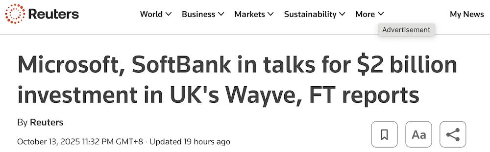 ▲路透社报道Wayve正与微软、软银洽谈20亿美元融资