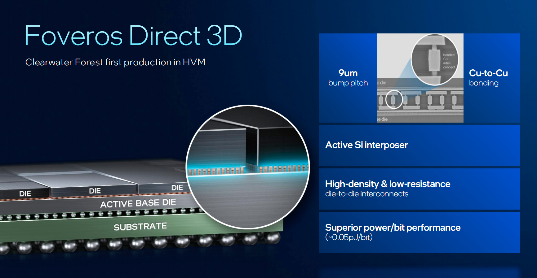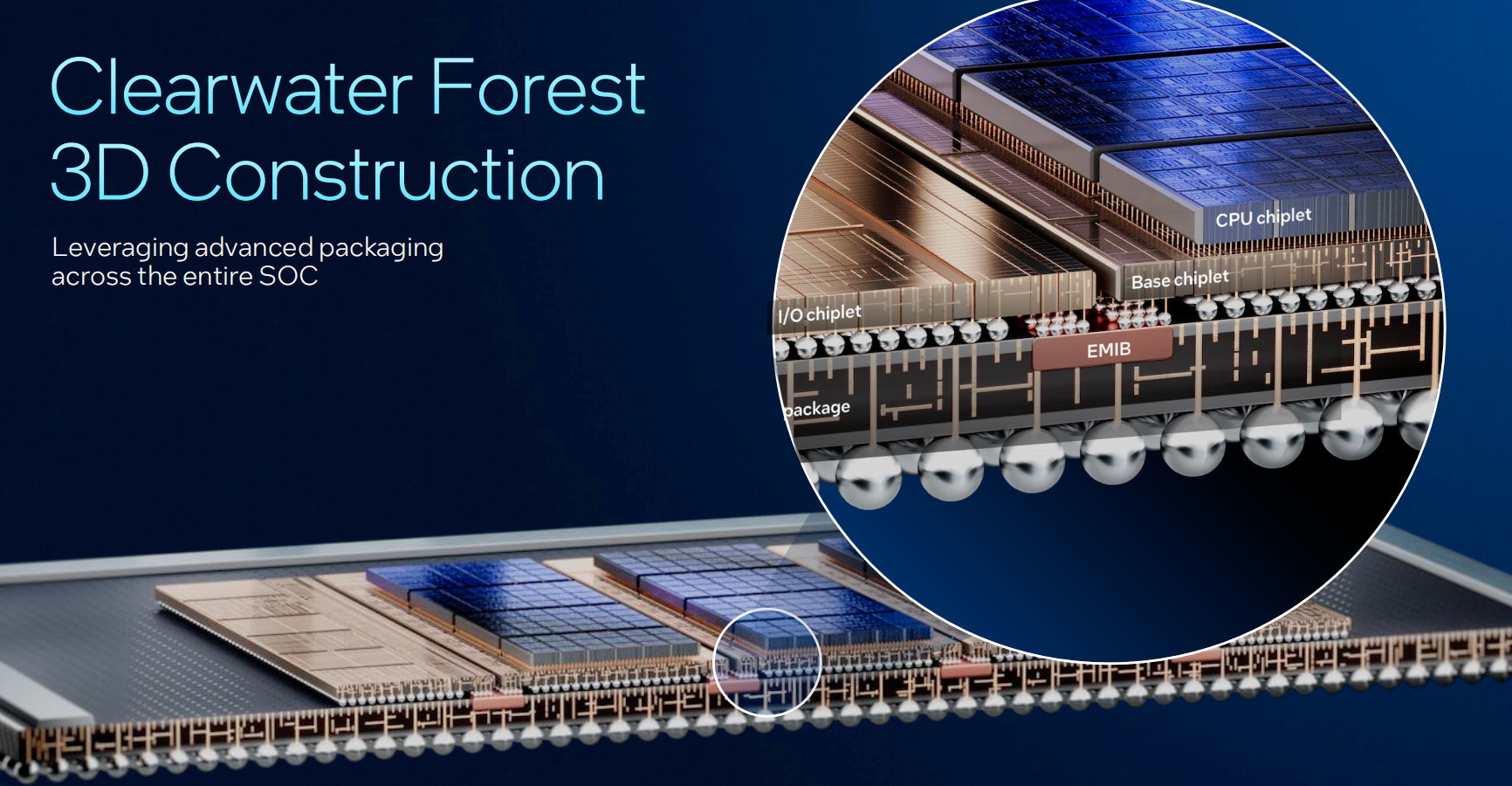 除了Intel 18A首次在服务器芯片Clearwater Forest上引入外,Clearwater Forest在SoC设计中充分利用了先进封装技术,即英特尔的全3D集成(Foveros Direct 3D)技术。