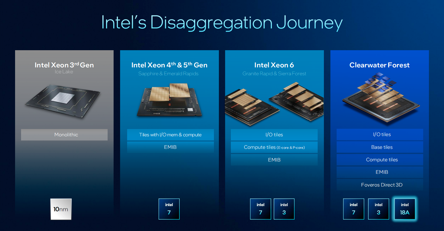 所以,整个Clearwater Forest某种意义上是一种3.5D的互联方式。而在Clearwater Forest中,也首次实现了英特尔三代先进制程工艺的集合。
