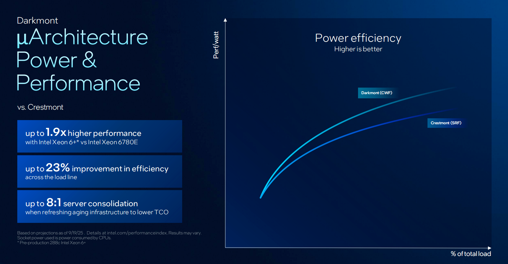 因此,整个Darkmont在相同功耗情况下,可以带来IPC17%的性能提升。整体上,相比Crestmont,至强6+处理器可以带来1.9倍以上的性能提升,同时在整体负载范围之内带来高达23%的能效提升,计算能效提升8倍。