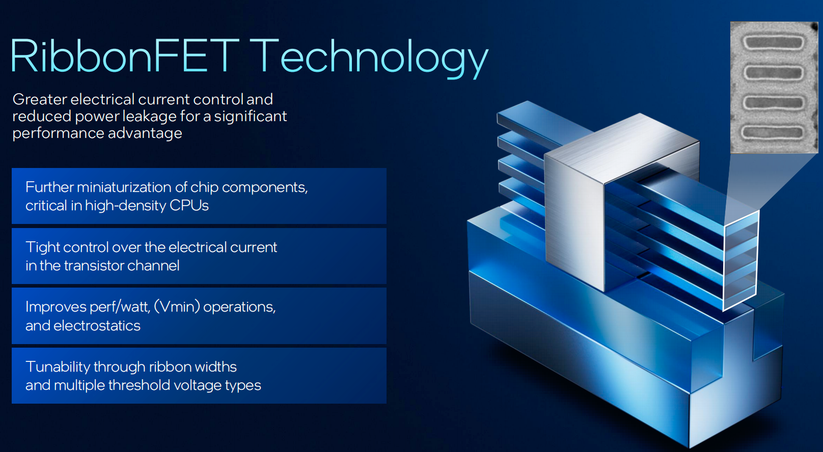 全环绕栅极技术(RibbonFET)通过先进的工艺将沟道以三维堆叠方式排布,可实现芯片进一步微型化,从而对高密度处理器的设计带来极大帮助。此外,因为栅极是通过全方位360环绕整个沟道,可以带来更低的功率损耗,同时可以通过调整纳米管的宽度来实现对管道内电流的精确控制。结合多阈值电压模块的设计,可以在不同尺度、不同设计上选择最优的纳米宽度和电压阈值来实现动态功耗以及静态功耗的平衡。