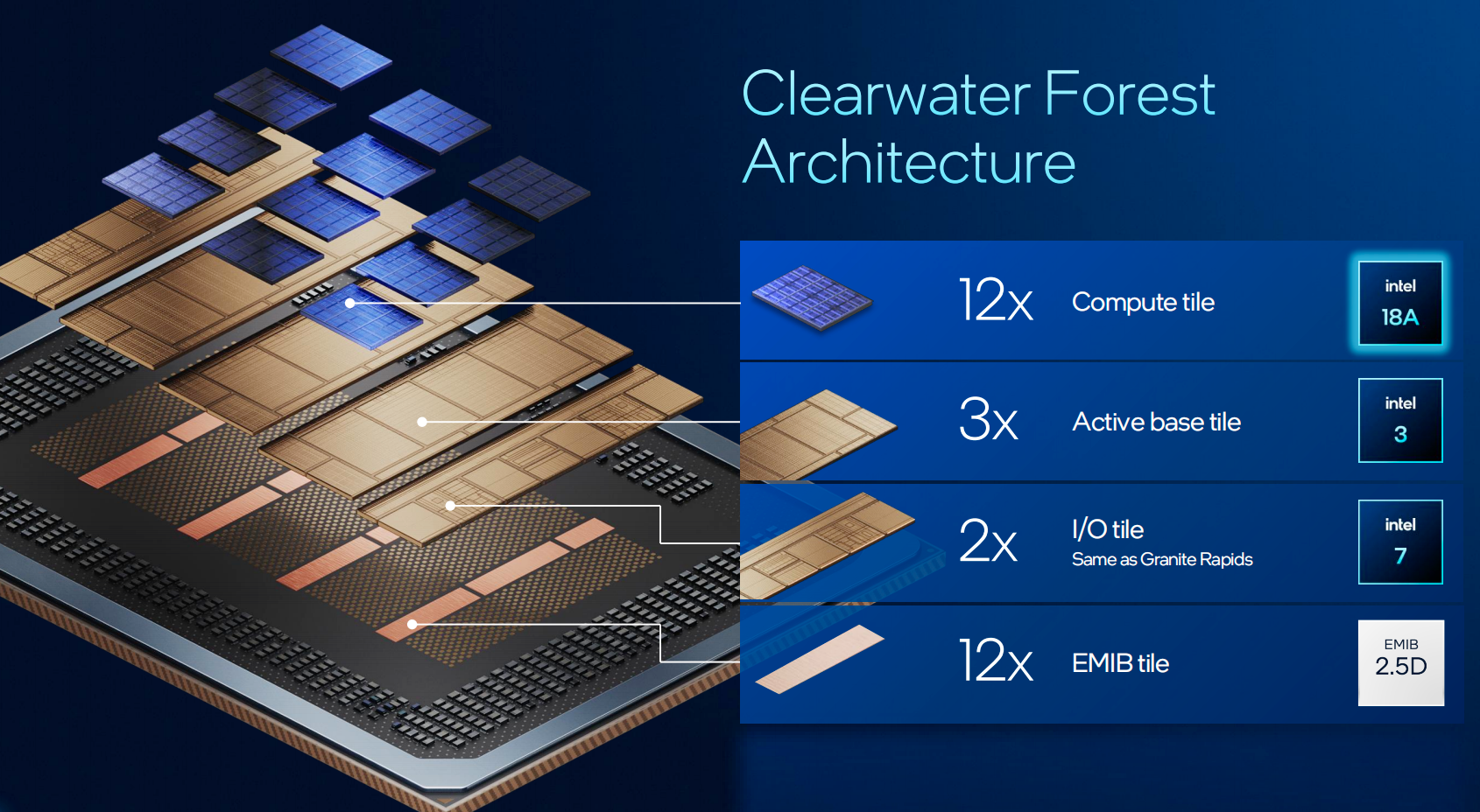 Clearwater Forest的12个计算模块对应12个CPU芯粒(Intel 18A工艺),通过3D混合键合铜互联技术,同下面的三个独立的有源硅基板(Intel 3工艺)相连。有源硅基板并非传统工艺,而是采用了Intel 3工艺来支持更高的互联以及三级缓存。三个有源硅基板和分布在左右的两个I/O单元(Intel 7工艺,具备高速I/O、互连结构和加速器),通过EMIB2.5D先进封装技术实现互联。