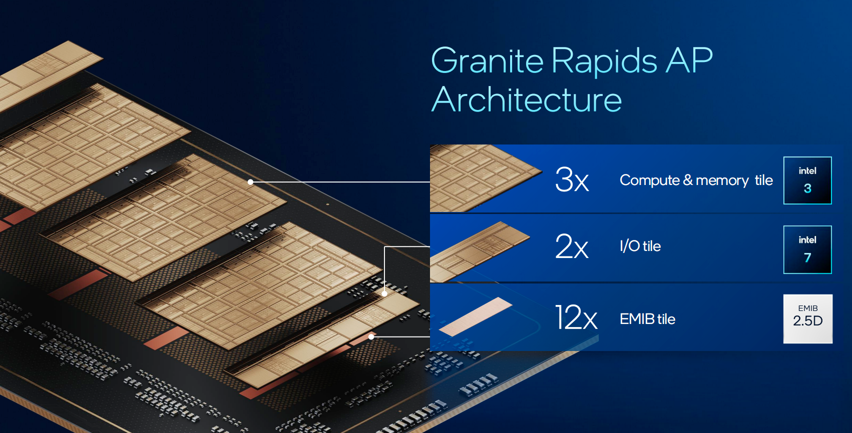 在至强6P核Granite Rapids的架构中,包括3个计算/内存模块(intel 3工艺),2个I/O模块(intel 7工艺)和12个EMIB模块(EMIB 2.5D封装工艺)。