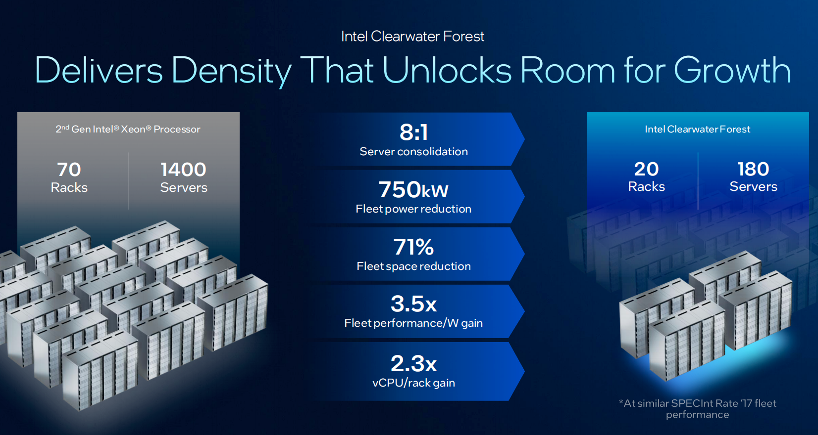 同第二代的至强处理器相比,使用20台机架180台Clearwater Forest服务器可以替代70个机架1400台第二代英特尔至强服务器,实现相同的算力,达到8:1的服务器整合比例。由于服务器和机架功率降低,可以降低整机功耗750KW,降低71%的数据中心占用空间,同时提升3.5倍的性能/功耗比,每台机架上也可以增加2.3倍的虚拟机部署数量。