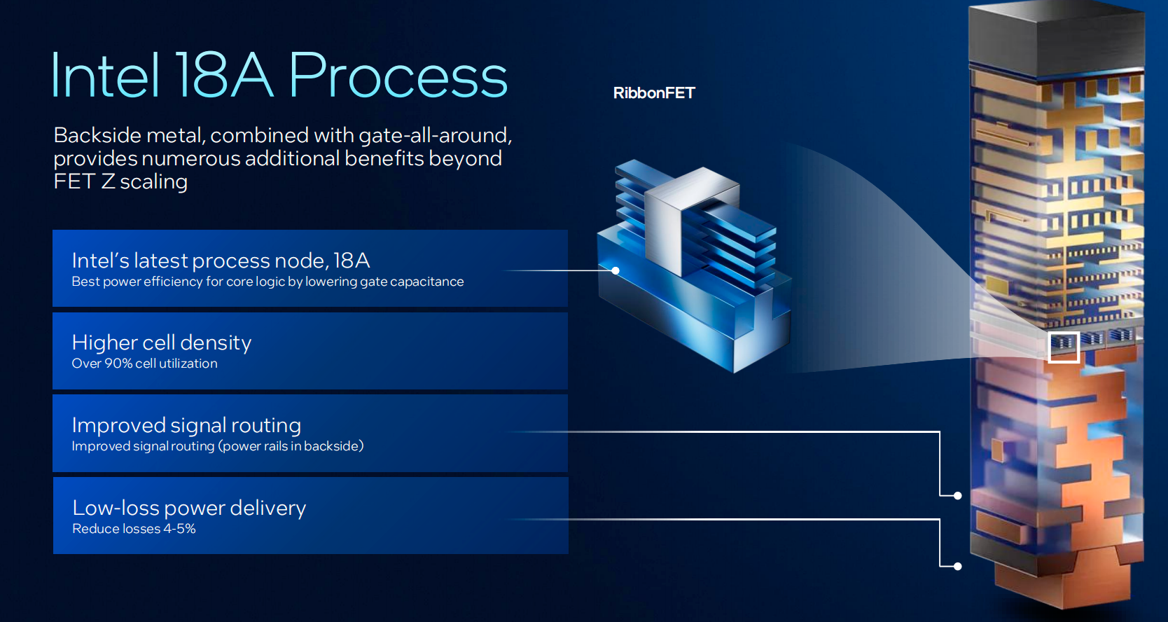 得益于RibbonFET全环绕栅极晶体管和PowerVia背面供电技术,Intel 18A相较Intel 3实现了在相同功耗下每瓦性能提升15%,在相同面积下芯片密度提升30%。其中,PowerVia背面供电技术充分利用硅片的两面,在正面传输数据信号,在背面为晶体管供电,从而在缩小晶体管尺寸的同时,也降低了功耗。