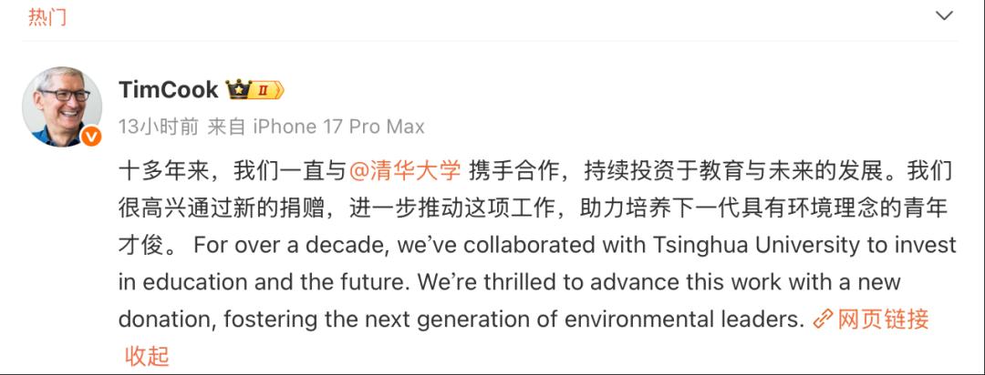 而随后,苹果公司还宣布向清华大学启动一项新的捐赠计划,旨在推进中国的环境教育并培养“下一代气候行动领袖”。公司表示这笔捐赠将用于设立覆盖全校的项目,帮助学生掌握可持续创新所需的知识与实践能力,并延续苹果在清华已有近十年的教育与产学合作。