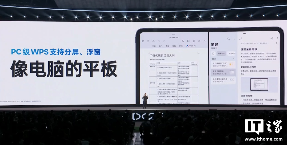 ColorOS 16 的平板设计也迎来大更新,优化大屏桌面布局宫格,更能装的 dock 栏,支持灵感主题;手写笔的体验也迎来加强,支持字迹实时美化、手写计算等;PC 级 WPS 支持分屏、浮窗。