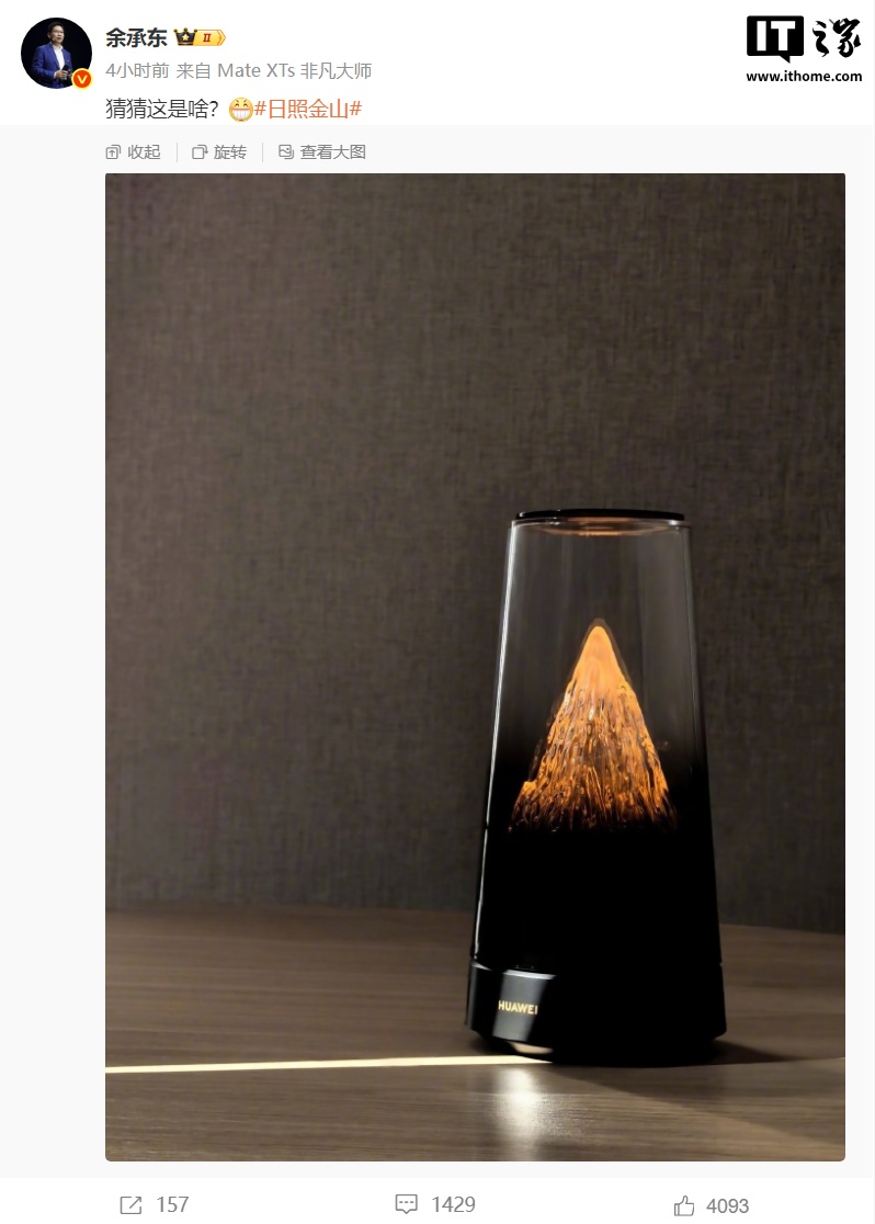 IT之家 10 月 15 日消息,华为常务董事、终端 BG 董事长余承东今日发布微博,晒出一款华为新产品,带有“日照金山”话题,并表示“猜猜这是啥?”
