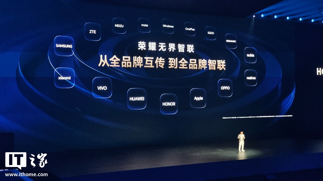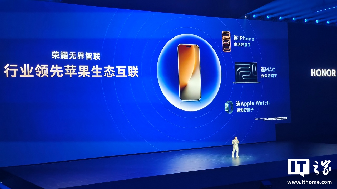 IT之家 10 月 15 日消息,在今晚的荣耀 Magic8 系列暨MagicOS10 发布会上,荣耀终端股份有限公司 CEO 李健宣布,荣耀无界智联将支持 iPhone、Mac、Apple Watch 互联,可实现一拖互传、通知实时显示等功能。