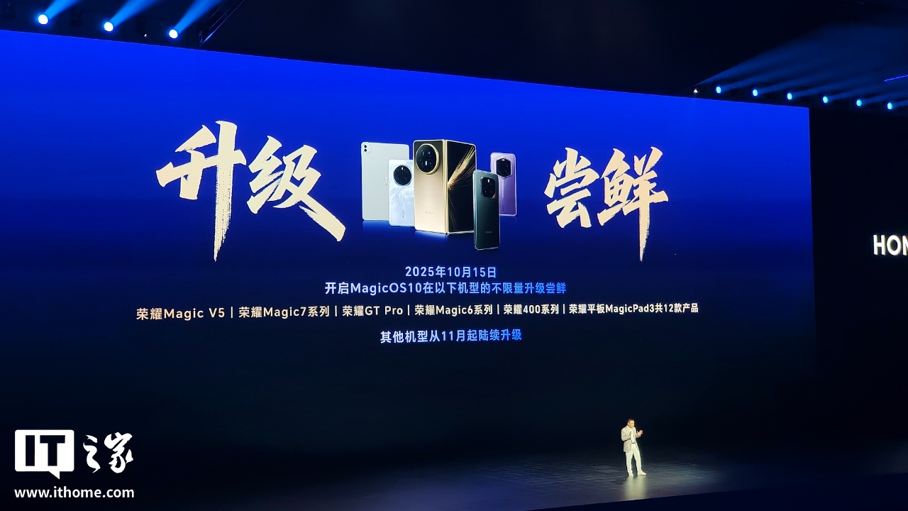根据规划,荣耀MagicOS 10 系统今日起开启部分机型的不限量升级尝鲜,含 Magic V5、Magic7 系列等,其他机型将在 11 月起陆续升级。