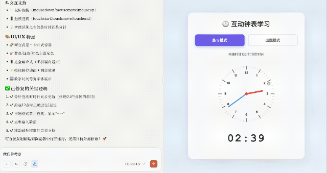 我们参考@zb1992 的提示词,让 Claude 4.5 Haiku 跑了一个钟表 Demo,整体体验下来,代码生成速度确实更快了,最终成品也令人满意。