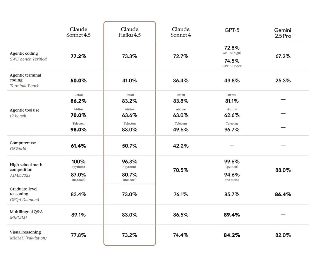 对比来看,GPT-5 mini 约为每百万输入 0.25 美元、输出 2.5 美元,Google 的 Gemini 2.5 Flash 价格差不多。也就是说,Haiku 4.5 的价格大约是 GPT-5 mini 或 Flash 的 4 倍。