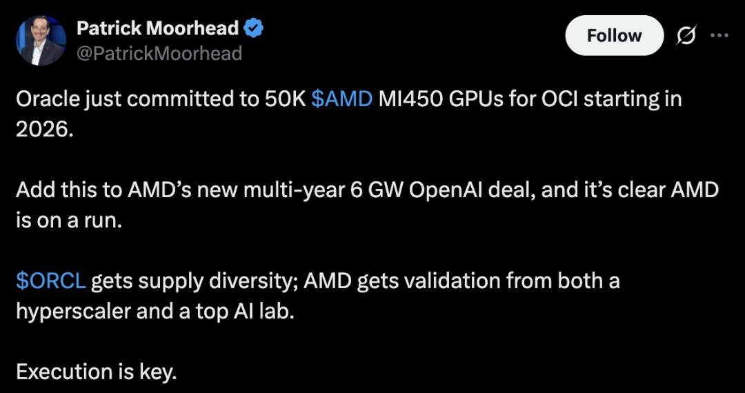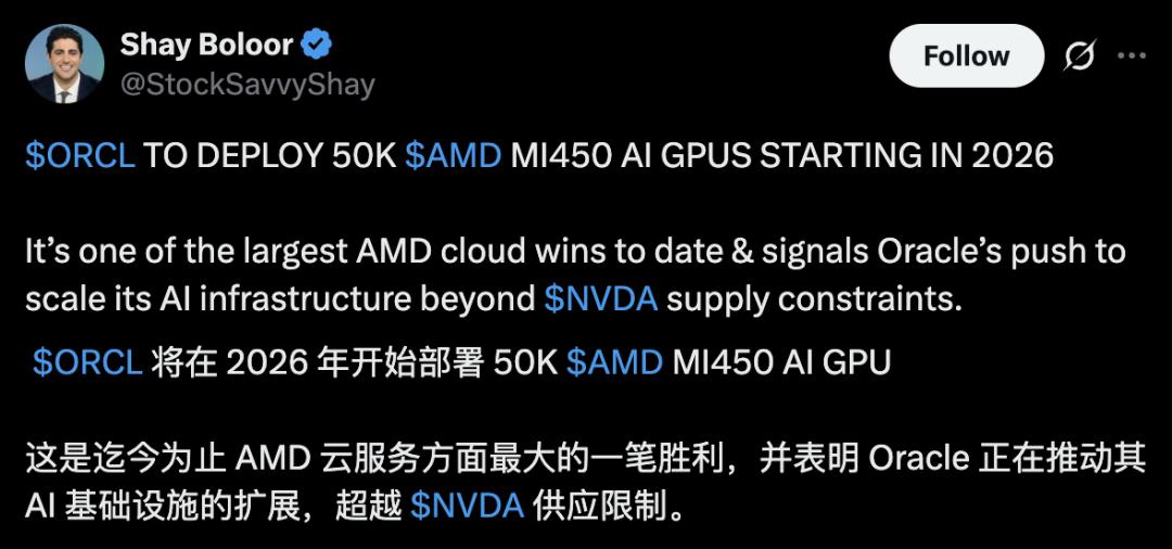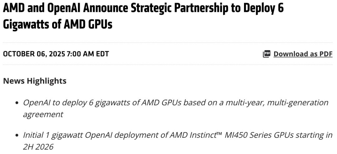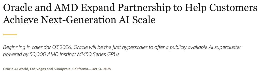 此次Oracle发布与AMD的合作公告,发生10月6日AMD与OpenAI达成的长期合作之后。