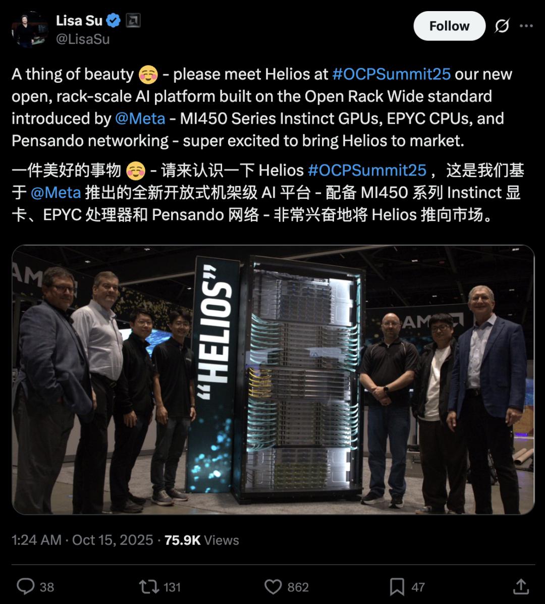 苏姿丰在社交媒体上,将搭载了Instinct MI450系列GPU的Helios称为「美丽之作」,表示非常高兴将其推向市场。