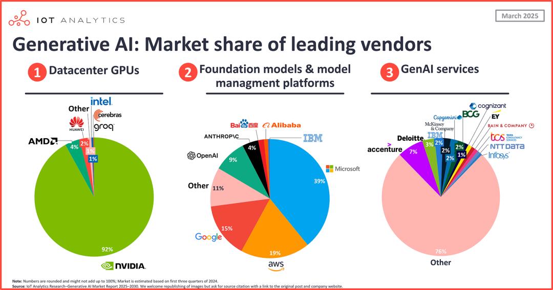 据IoT Analytics 2025报告数据显示,截至2025年第二季度,在数据中心GPU市场,英伟达保持主导地位,市场份额达到92%。