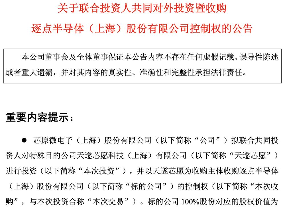 芯东西10月16日报道,10月15日,上海半导体IP龙头企业芯原股份发公告宣布,拟联合共同投资人对特殊目的公司上海天遂芯愿进行投资,并以天遂芯愿为收购主体收购逐点半导体(上海)股份有限公司的控制权。逐点半导体100%股份对应的股权价值为9.5亿元
