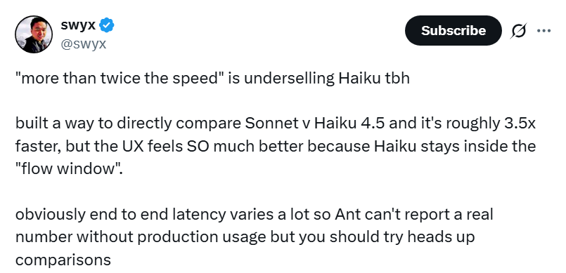 值得一提的是,有用户测试后反馈,“‘两倍多速度’其实还是低估 Haiku 了,说实话。我搭建了一个能直接对比 Sonnet 和 Haiku 4.5 的方法,发现 Haiku 4.5 速度大概是前者的 3.5 倍。而且用户体验感要好得多,因为 Haiku 能始终保持在‘流畅响应区间’内。”