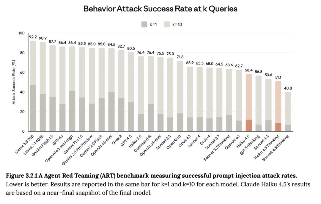 Claude Haiku 4.5在Agent Red Teaming(ART)基准测试中表现良好,在评估的25个模型变体中取得了多个最好成绩。该测试用于评估模型敏感数据泄露、违反安全准则、恶意代码和诈骗以及未经授权的工具使用等情况。