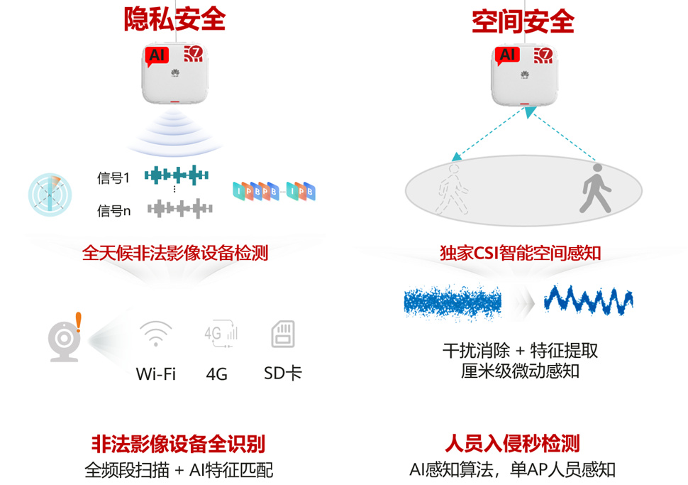 作为安全外延的主要部分,空间安全与隐私安全的落地,彰显了技术对人性需求的回应。在高管办公室、档案室等无法或不便部署摄像头的隐私敏感区域,华为Wi-Fi AP通过CSI技术及AI算法,可实现厘米级的微动感知,实时监测人员入侵,这样既杜绝了安全盲区,又保护了个人隐私。更引人注目的是业界首款防偷拍AP,针对敏感场景隐藏偷拍现象频发的问题,其内置的AI特征匹配算法可精准识别62个品牌110款影像设备,无论Wi-Fi回传、蜂窝回传还是本地存储,都可实时识别并告警。