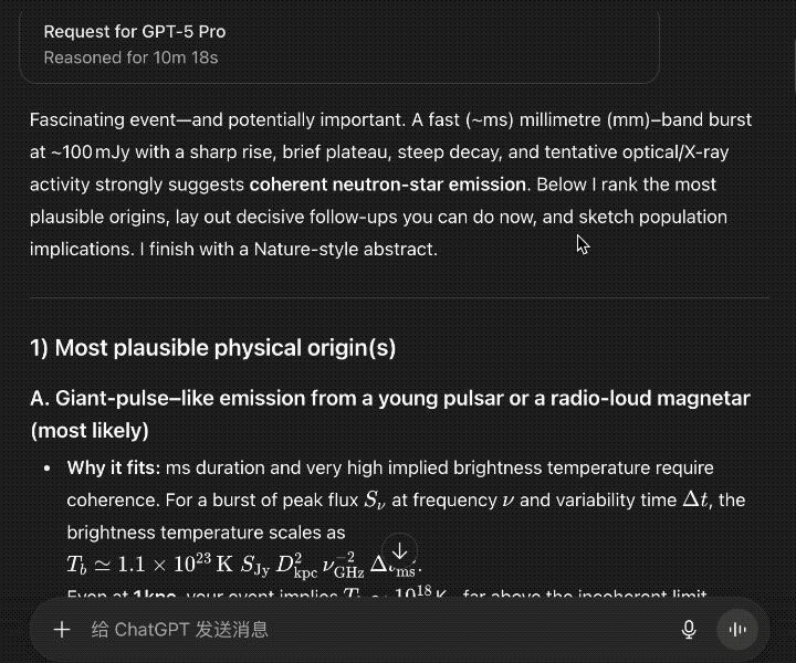 用时10分钟18秒,GPT-5 Pro给出了可能的理论解释,提供了后续观测建议,同时也把论文摘要写完了。