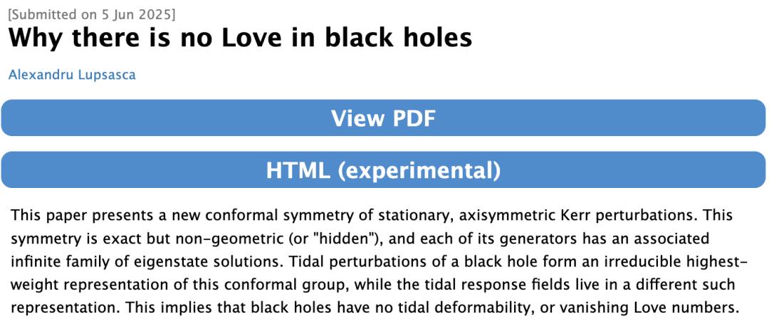 今年夏天,他发表了一篇关于黑洞微扰理论中新对称性的论文,揭示黑洞没有潮汐形变的能力,即勒夫数(Love Number)为零。