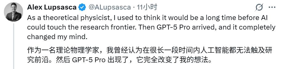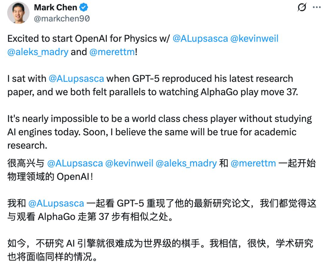 OpenAI 首席研究员 Mark Chen 在为 Lupsasca 加入 OpenAI for Science 团队表示激动之余,也关注到了 GPT-5 在短时间内重现黑洞物理研究的表现。