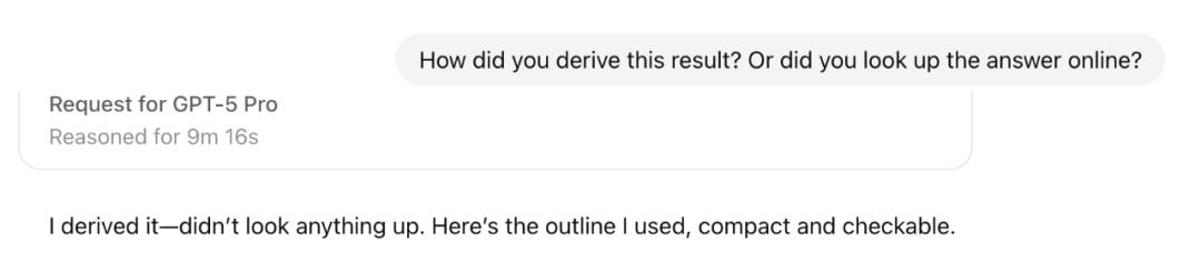 Lupsasca 对 GPT-5 Pro 的快速回应产生了怀疑,便询问了 GPT 是否从网上寻求相关答案,但 GPT-5 Pro 在 9 分 16 秒的推理后否认,并再次给出了推理过程。
