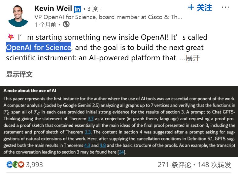 他所加入的,正是 OpenAI 在今年 9 月由其首席产品官(CPO)Kevin Weil 宣布开启的一项雄心勃勃的新计划:打造一个 AI 驱动的平台,以加速人类的科学发现进程。