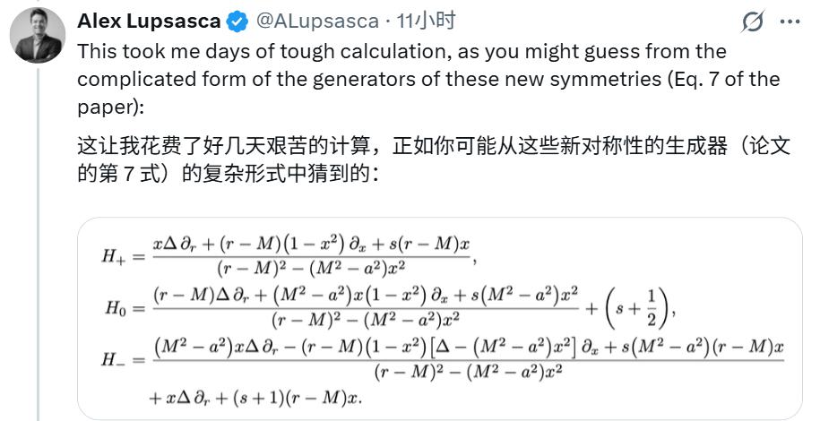 Lupsasca 本人表示,一旦这些对称性被知晓,要揭示其物理意义相对容易,但「最困难的部分是找到它们精确的数学形式(甚至确定它们是否存在)」。他表示,这个过程花费了他「数天时间的艰苦计算」,其结果的复杂性从论文中的公式就可见一斑。