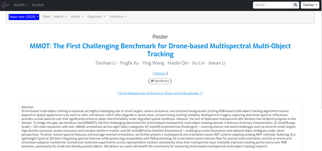 论文详情:Tianhao Li, Tingfa Xu, Ying Wang, Haolin Qin, Xu Lin and Jianan Li. MMOT: The First Challenging Benchmark for Drone-based Multispectral Multi-Object Tracking[J]. Advances in Neural Information Processing Systems, 2025(来源: 北京理工大学)