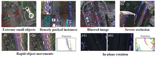 团队构建了首个国内外无人机航拍多光谱目标数据集。其覆盖城市街区、交通枢纽、运动场地等多种真实场景的航拍视频,包含125段视频序列、48万余个高精度标注目标框,涵盖8个典型类别(行人、汽车、自行车等)。多光谱成像跨越可见光至近红外范围,涵盖多种挑战场景如极小目标、密集目标、图像模糊、严重遮挡、快速运动和平面内旋转等,如图3所示。