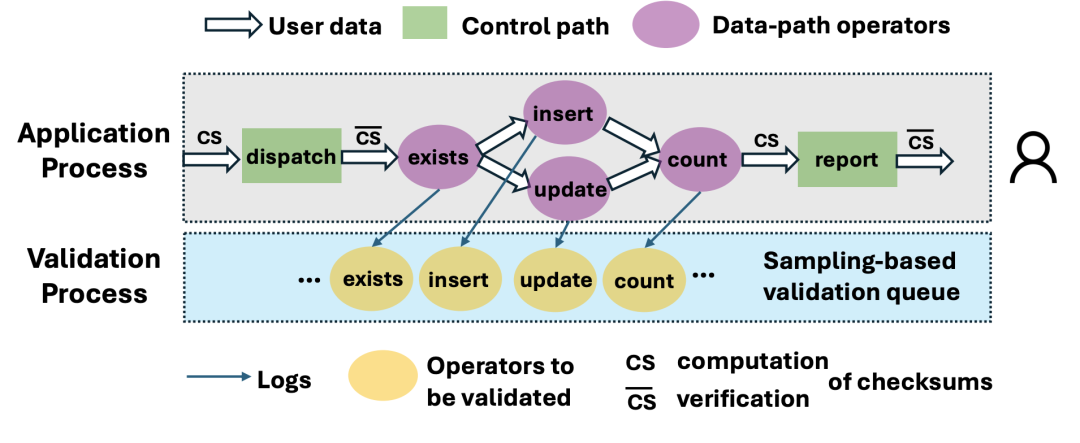 针对上述挑战,实验室提出了目前为止第一个面向处理器静默错误的在线检测系统,并完成论文《Orthrus: Efficient and Timely Detection of Silent User Data Corruption in the Cloud with Resource-Adaptive Computation Validation》,第一作者为实验室博士生刘晨骁,指导教师为崔慧敏、杜子东、王晨曦等。论文在跨编程语言、运行时、操作系统构建全新的程序语义感知的数据中心系统软件(Semantics-Aware Cloud)的思路框架下,以极低的运行时性能开销(约2%-6%),实现了静默错误的高效检测,显著提升了数据中心服务的可靠性。Orthrus观察到:云应用程序的代码结构通常可分为控制路径(Control Path)和数据路径(Data Path)。控制路径负责调度与分发等控制逻辑,不直接操作用户数据;数据路径则执行对用户数据的具体操作。为此Orthrus设计了一种混合策略:对控制路径采取校验和方式,对数据路径采取重新执行方式,以此实现高效的错误检测。同时为支撑该机制,Orthrus在编译、系统与运行时层面引入了一系列创新技术(见图1)。