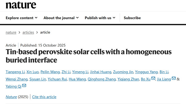 相关成果以《基于均一埋底界面的锡基钙钛矿太阳能电池》(Tin-based perovskite solar cells with a homogeneous buried interface)为题,于北京时间10月15日晚间在《自然》(Nature)期刊以加速预览的形式在线发表。