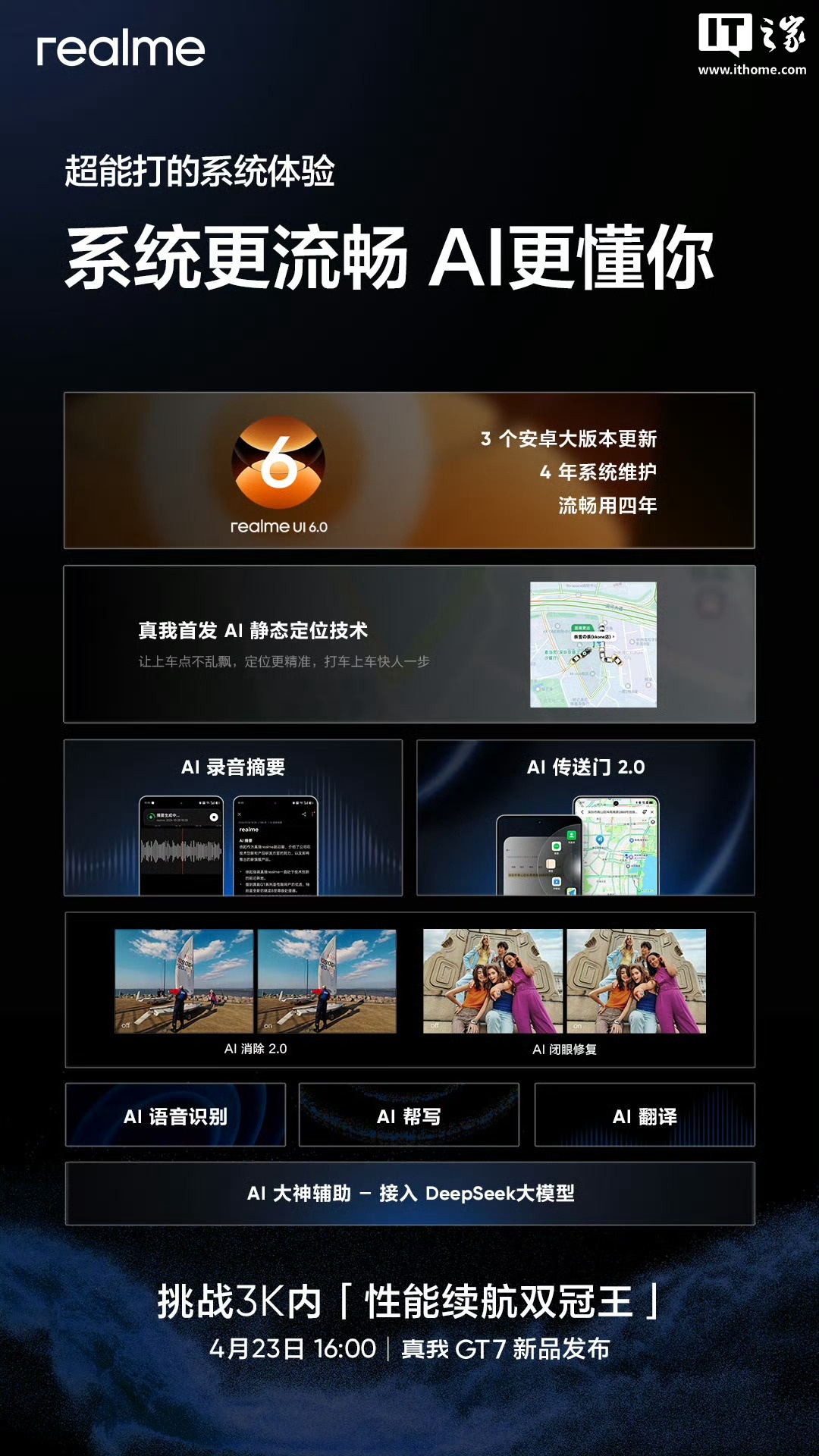 作为参考,在今年 4 月 23 日发布的真我 GT7 手机预装了 realme UI 6.0 系统,支持 4 年系统维护、拥有 3 个安卓大版本更新,号称“流畅用四年”。